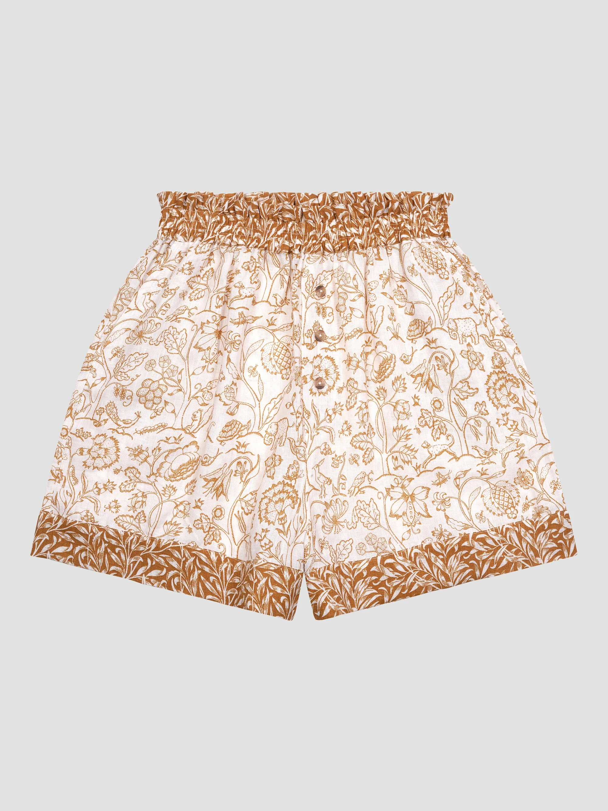 Designed in collaboration with Morris & Co., our Ernest White linen women’s pyjama shorts set features the whimsical Middlemore pattern inspired by a quilt embroidery created by May Morris in 1889. Featuring delicately drawn flora and fauna, the classic motif pays homage to the brand’s rich heritage while faithfully reimagining it for modern living.