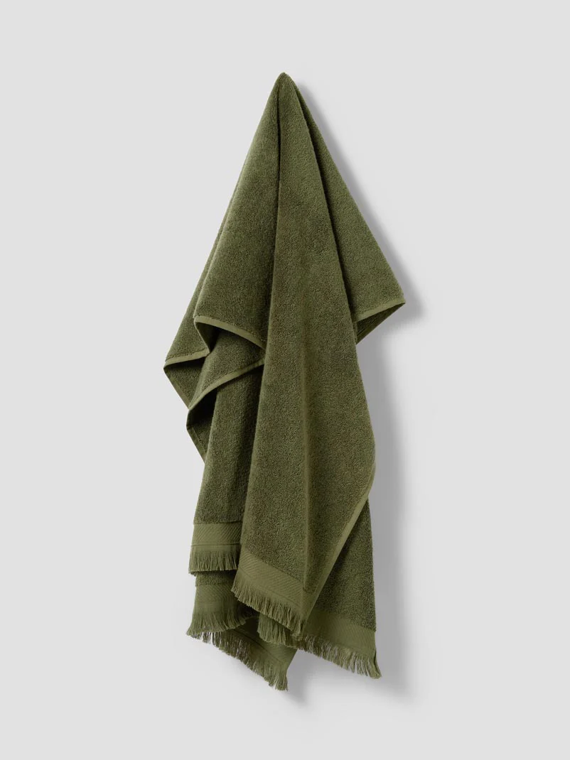 Scrub up well with our irresistibly plush Olive Green Fringe Edge towels. Woven from long-staple, single-yarn cotton, they’re naturally soft and durable, with a delicate fringe edging to finish. Available in three sizes (bath sheets, bath towels, and hand towels), they’re perfect for mixing and matching with other colours and patterns from our collection.