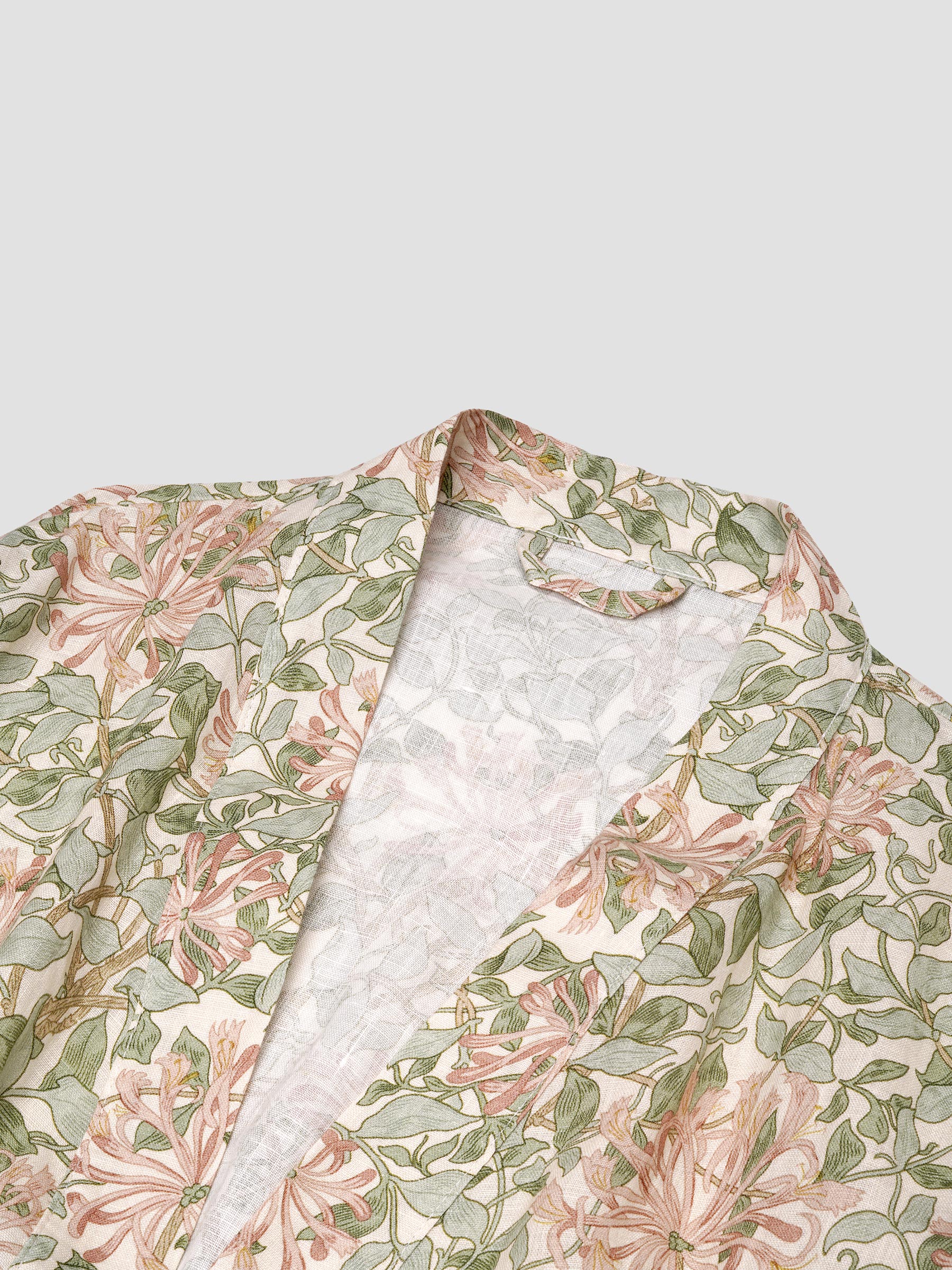 Designed in collaboration with Morris & Co., our Soft Sage linen robe features the iconic Honeysuckle pattern created by May Morris in 1883. With its climbing stems and clusters of delicate blooms, the classic motif pays homage to the brand’s rich heritage while faithfully reimagining it for modern living.
