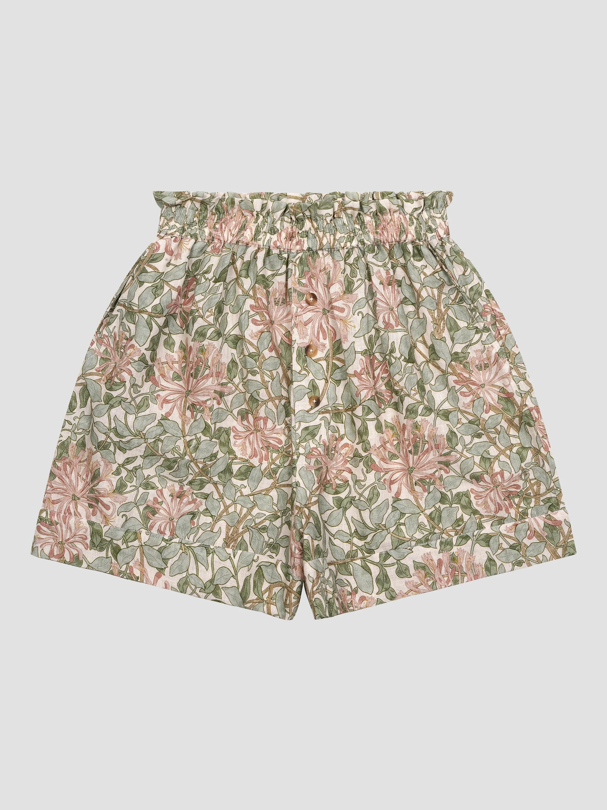 Designed in collaboration with Morris & Co., our Soft Sage linen women’s pyjama shorts set features the iconic Honeysuckle pattern created by May Morris in 1883. With its climbing stems and clusters of delicate blooms, the classic motif pays homage to the brand’s rich heritage while faithfully reimagining it for modern living.